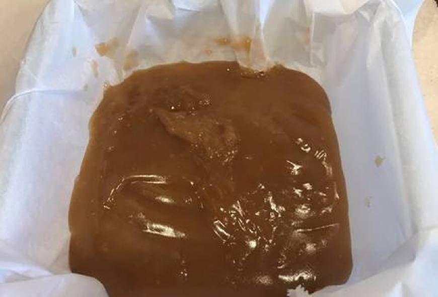 2.在玻璃保鮮盒內鋪一張曲奇紙,倒入楓糖漿餡,放涼冷藏備用。