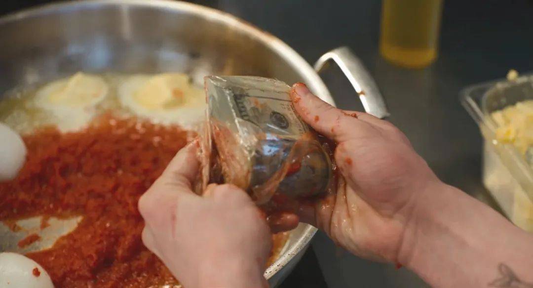 男主親自下廚時才發現,原來番茄醬裡另有乾坤——每罐都藏著一疊鈔票,加起來正好30萬。