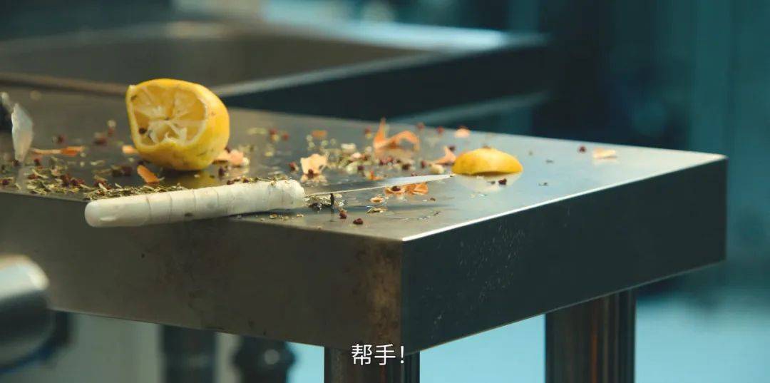 鏡頭直接進入餐廳的廚房,展示用餐高峰期幾近“爆炸”的工作場景,高溫、幹燥的環境,忙個不停的廚師,不停“吐”單的機器,四周充斥著各種催促叫喊和詛咒謾罵……