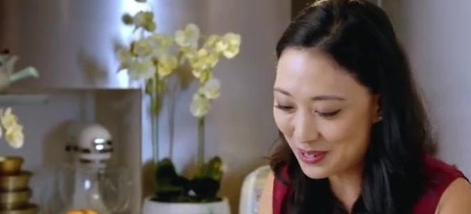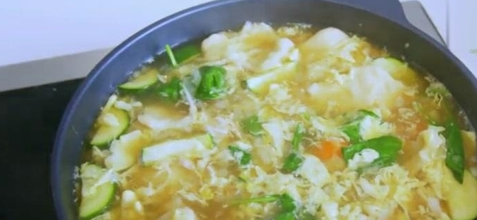 然後輕輕地倒入,訣竅是不要立刻翻動,你就這樣讓蛋花逐漸成型,再小心地攪拌加以混合,這是你正在尋找的這些蛋絲帶。