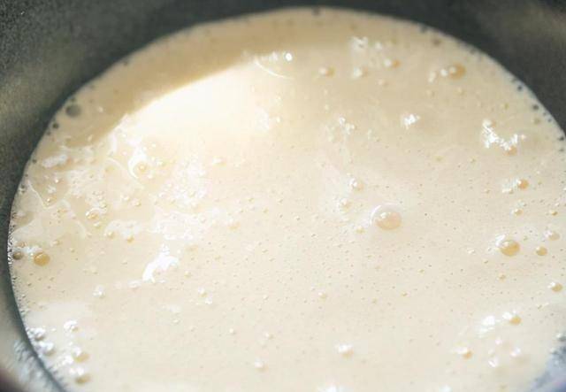 第四步,讓玉米糊和梨汁充分融合。大約需要15分鐘。當你看到它變稠時,你就可以關火瞭。準備一個方形盤子,上面放一張烘焙紙。;