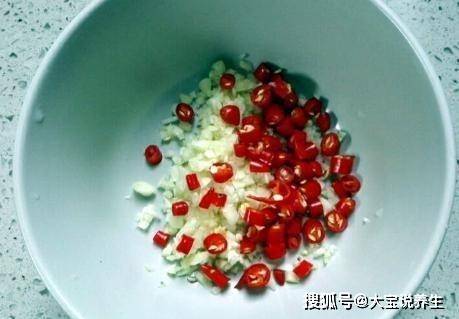 第四步,小米椒去根,洗凈,切丁,將炒好的花生米用搟面杖壓碎,和空心菜一起放入容器中,加少許鹽、香油、醋和調料很鮮;