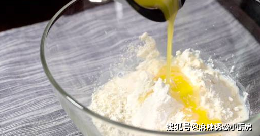 3.低筋面粉中分別加入鹽、細砂糖、蘇打粉,用刮刀拌勻。再加入過程2中的牛奶和黃油,先用刮刀拌勻,再手揉成面團