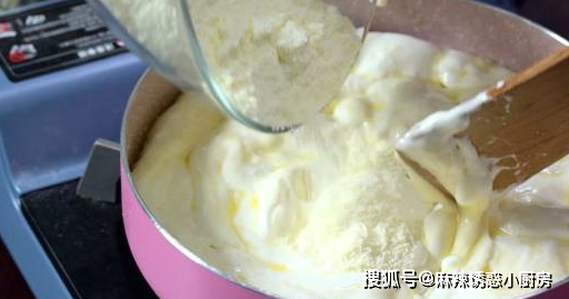 9.棉花糖和黃油融化後,出現微微拉絲狀態,加入奶粉,用刮刀幫忙拌勻