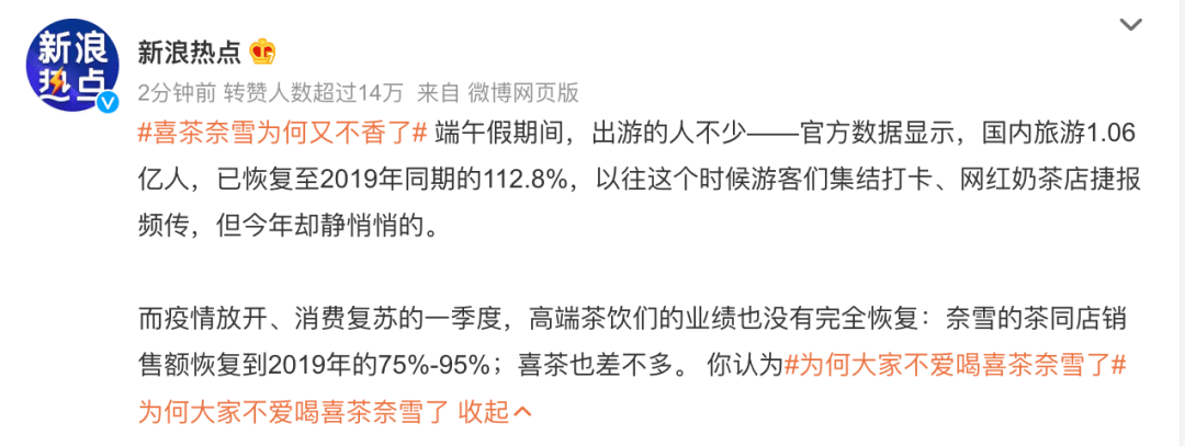 今年端午假期,旅遊的人多瞭,但消費高端茶飲的人卻變少瞭,網紅奶茶靜悄悄。(圖/微博@新浪熱點)