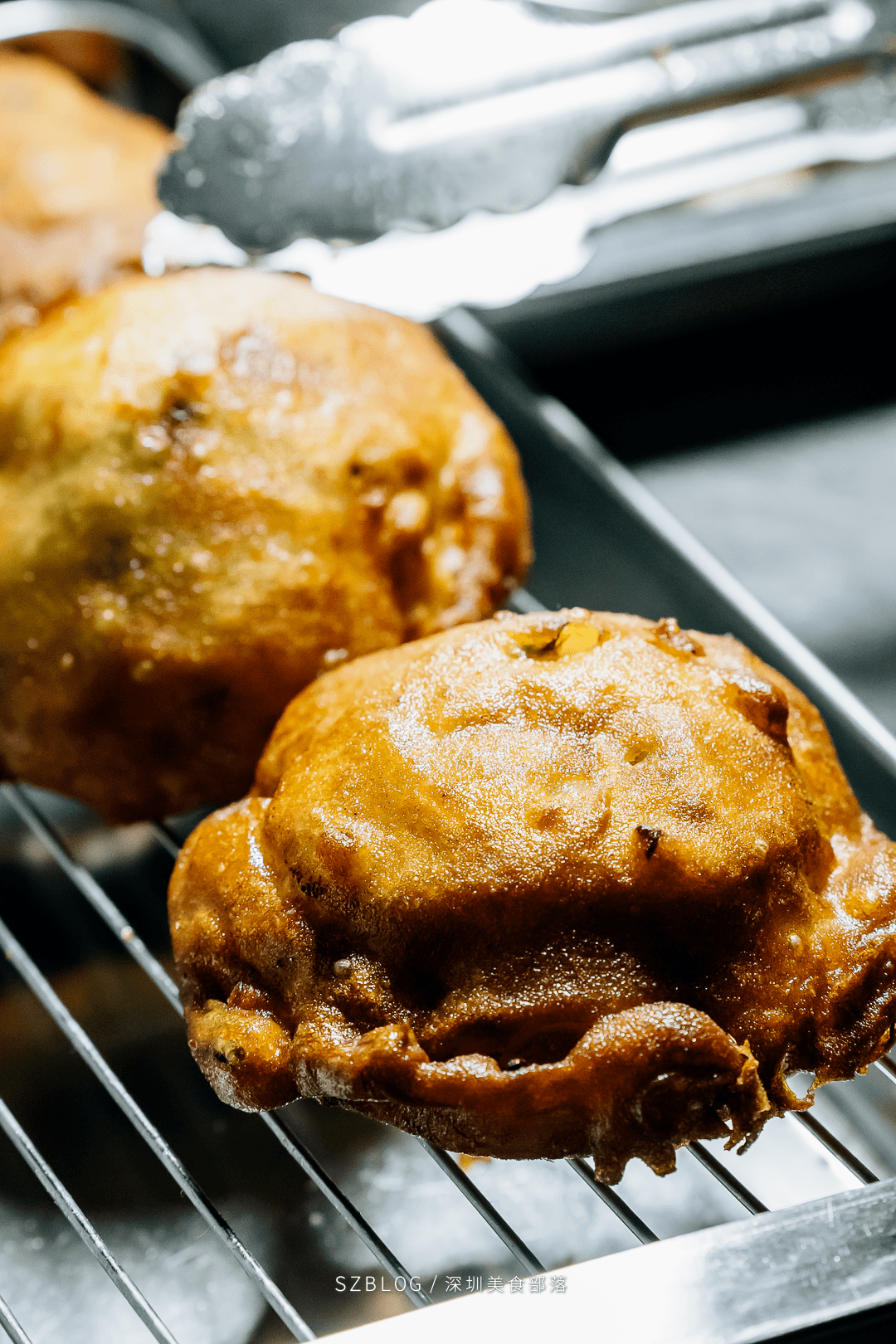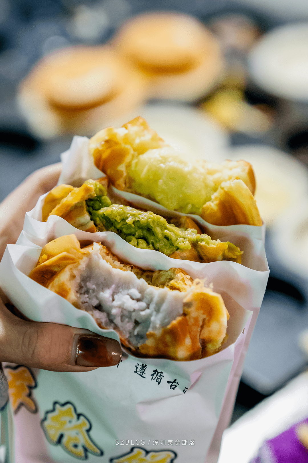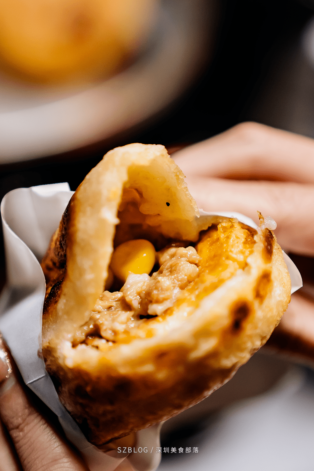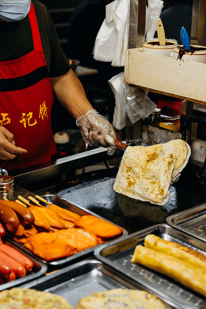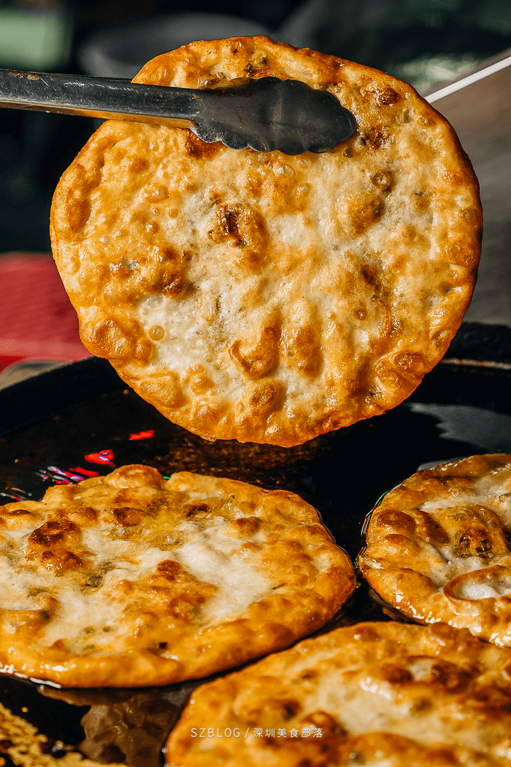 它算是鹽田街的老網紅瞭,老板靠著傢傳手藝在這擺攤,面餅和餡料都是每天自己親手準備的。炸至焦黃酥脆的面餅,夾著肉餡、蔥花,入口香脆有嚼勁,第一次吃的我被它圈粉瞭。可以多加幾種配菜,吃起來口感更豐富哦~