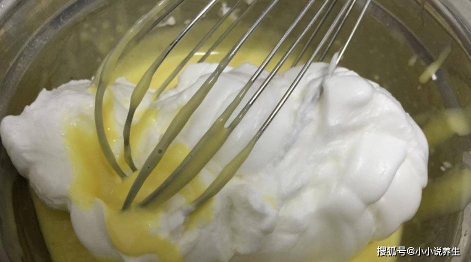 第三步,將打好的蛋清分次加入蛋黃糊中,上下翻動,慢慢翻勻。