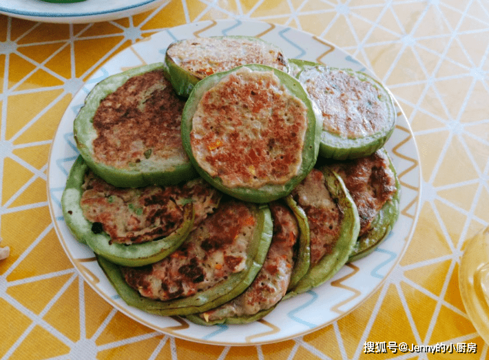 平底鍋刷油,放入茄子圈,再放入餡料,填滿後開小火,煎到兩面金黃,這款早餐就做好瞭。
