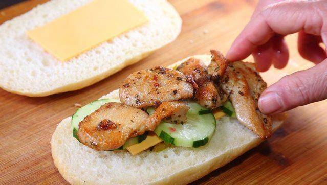 將拖鞋面包對半切開,底層面包中間塗上酸黃瓜,起司片切半,分別放在2片切開的面包上,備用。