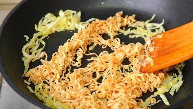 續加入步驟1的泡面翻炒約1分鐘後倒入調味粉拌勻,盛盤備用。