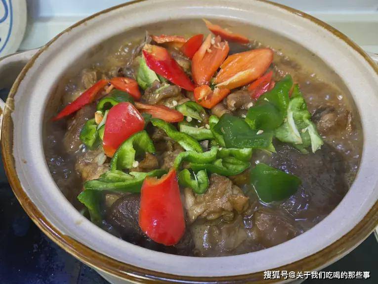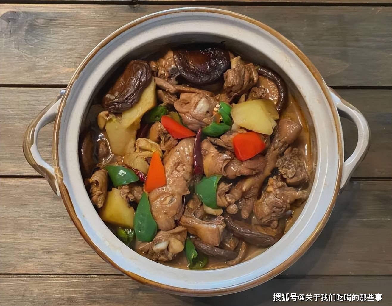 4、倒入適量開水沒過雞塊,放入幹香菇、土豆,泡香菇的水也倒進來,加適量食鹽,小火燉20分鐘,雞肉燉熟後放入青紅椒翻炒均勻,轉大火收汁,湯汁濃稠後即可出鍋。
