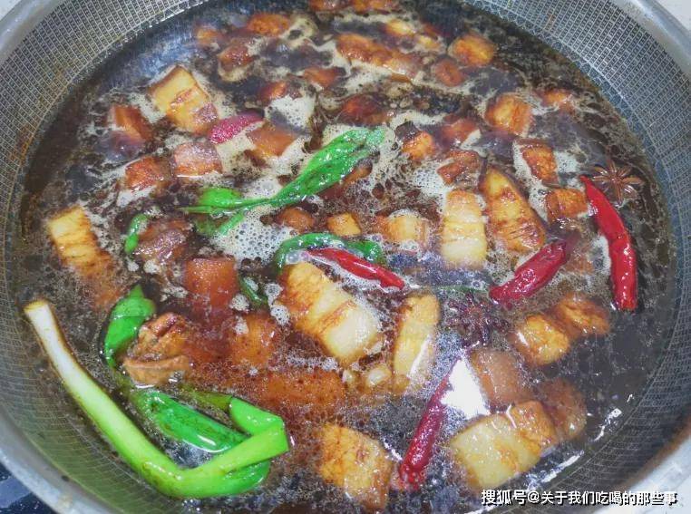 五花肉、香蔥、生薑、幹辣椒、八角、桂皮、菜籽油、冰糖、老抽、食鹽、生抽、料酒。