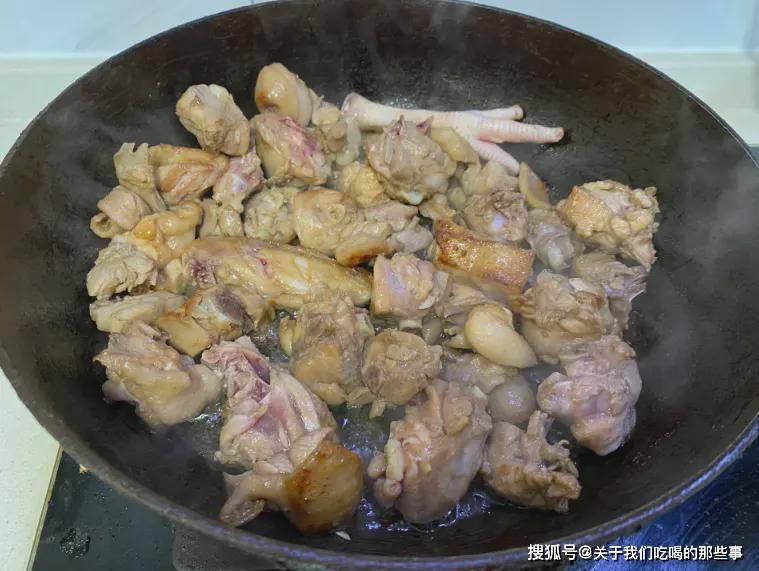 2、土豆去皮洗幹凈,切成大塊,青紅椒洗幹凈後切塊,蔥薑蒜切片。起鍋放入適量油,倒入醃好的雞肉小火翻炒,炒幹雞肉的水分,炒至顏色焦黃。