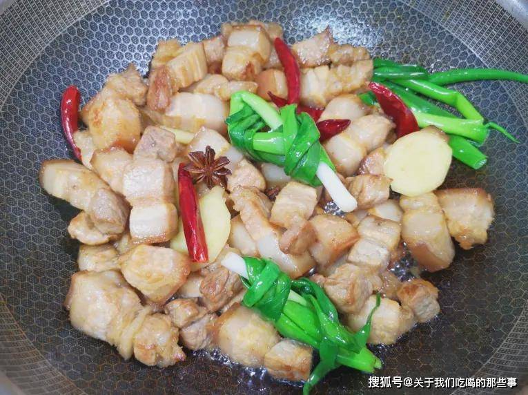 2、鍋裡留底油,放入蔥薑爆香,倒入五花肉塊小火煸炒一會兒,炒出油脂就沒那麼油膩瞭,顏色金黃後放入八角、桂皮、幹辣椒炒香,放入料酒、生抽、老抽翻炒均勻。