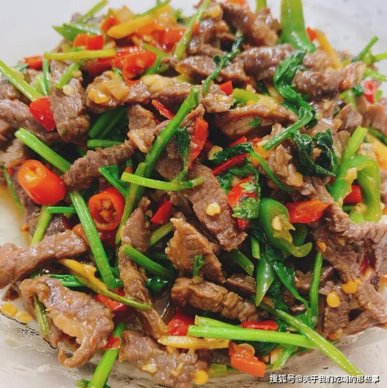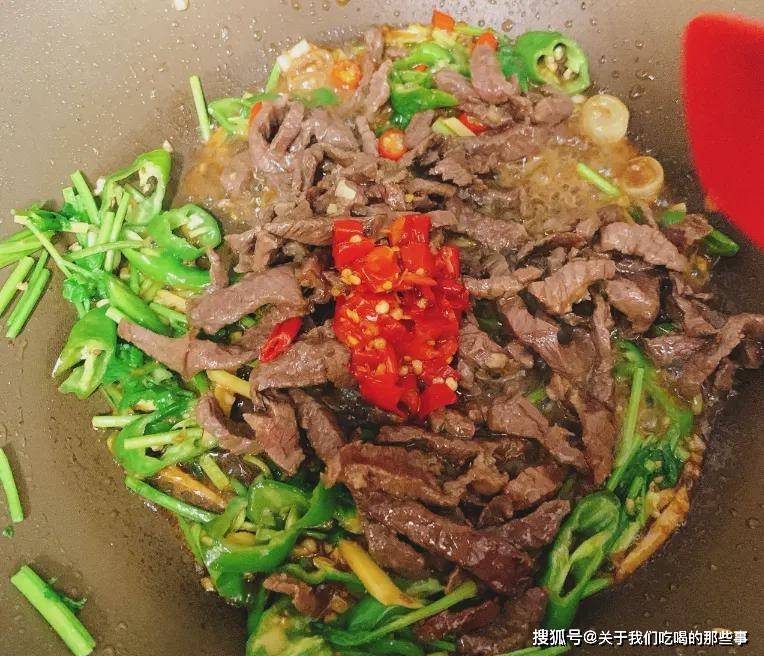 3、鍋裡留底油,放入蔥花、蒜末、薑末、剁椒,大火炒香後放入尖椒、香菜,倒入炒好的牛肉條,大火翻炒均勻即可出鍋。