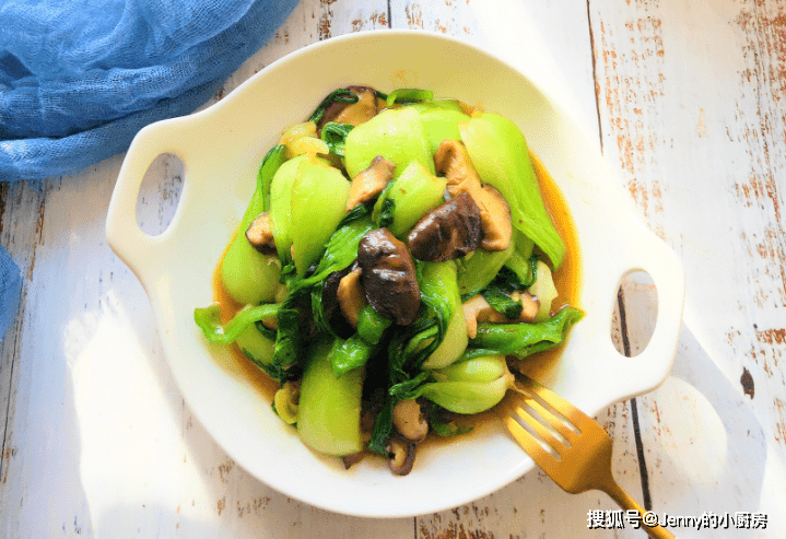 鍋內加油,燒熱後倒入香菇翻炒,炒出水分,再倒入青菜翻炒,炒到略微打蔫的程度。