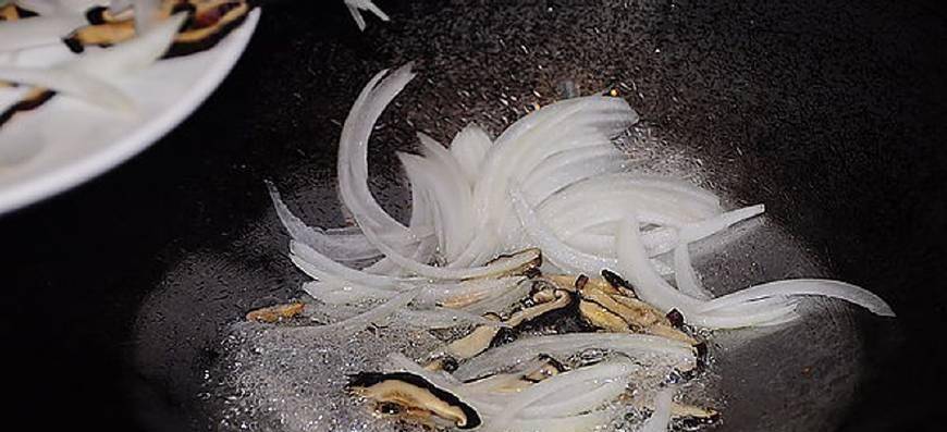 如果鍋真的被攪動瞭,噼裡啪啦噼啪作響,而且很快!加熱少許油,將洋蔥和香菇炒香。