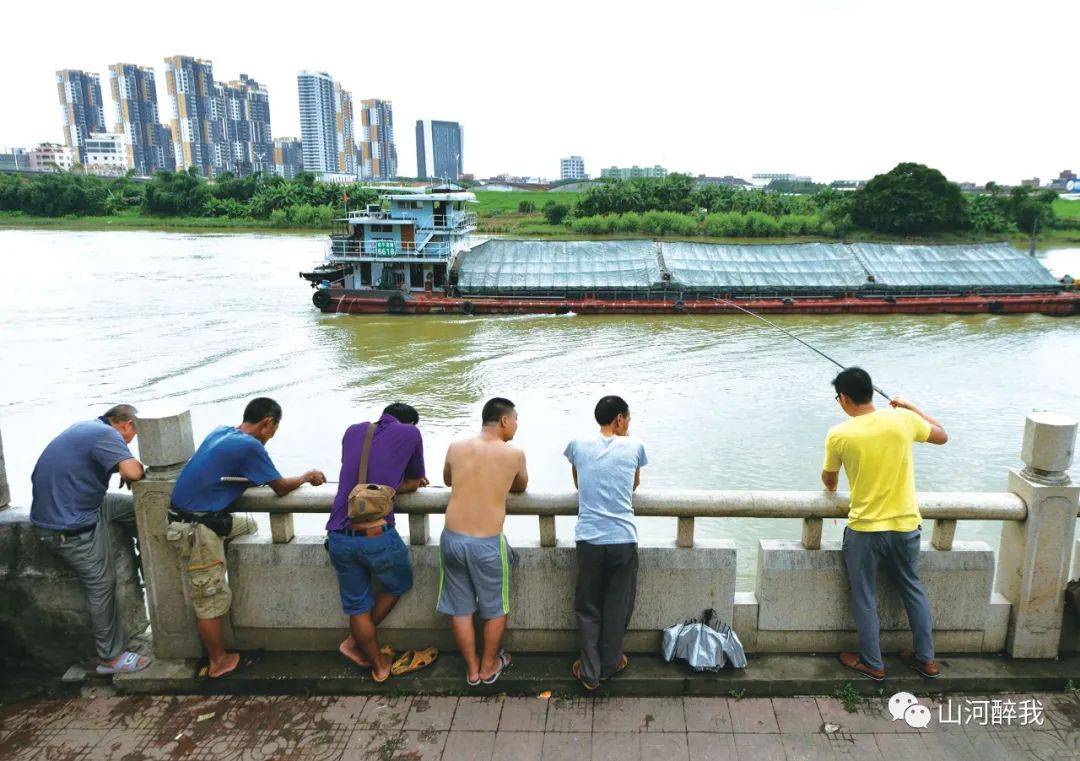 石灣酒廠門前的河流。河上有船,岸邊有人在釣魚。
