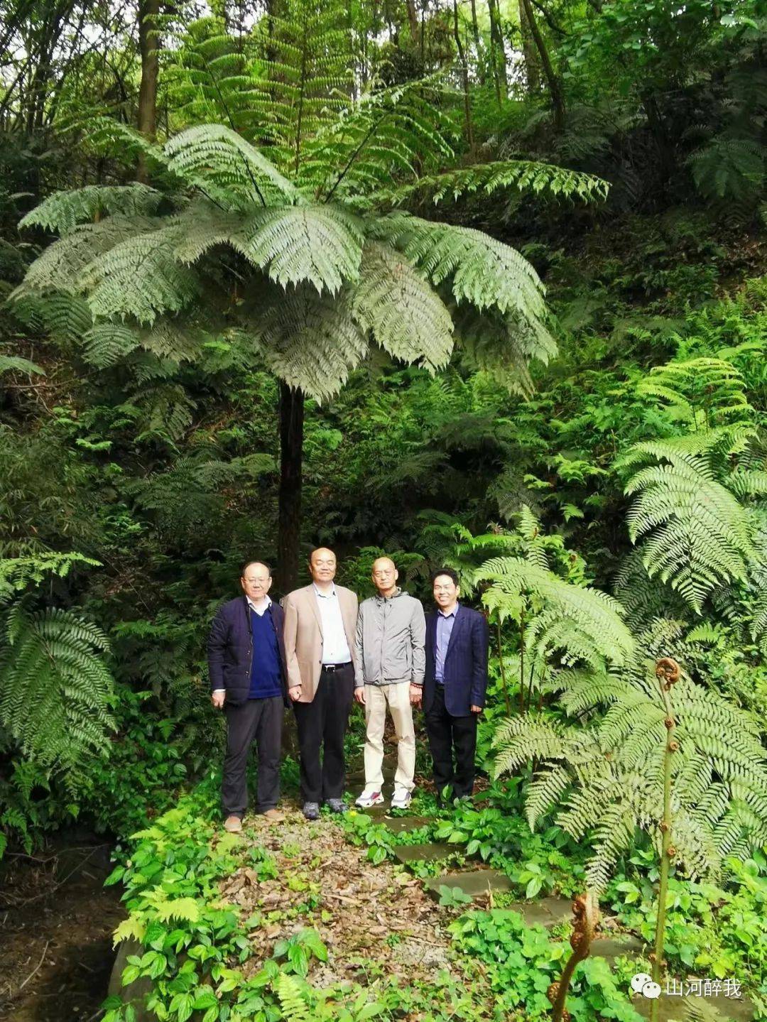 李尋老師(左一》、李傢民大師(左二)參觀金喜來酒廠,受到酒廠總經理張仁友先生(右一)、總工程師曾盛全先生(右二)的熱情接待,在桫欏樹下合影。