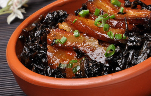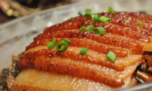 梅菜扣肉,是漢族傳統名菜,屬客傢菜。以五花肉和梅菜為主要制作材料。其做法通常是將五花肉上鍋煮透,再加老抽,並油炸上色,然後,再將其切成肉片。之後,加蔥、薑等調料翻炒,然後下湯用小火燜爛,再將五花肉盛入碗內,並在上面鋪上梅菜段,倒入原湯蒸透。走菜時,要把肉反扣在盤中。做好的梅菜扣肉,吃起來咸中略帶甜味,肥而不膩,頗受廣大食客喜歡。