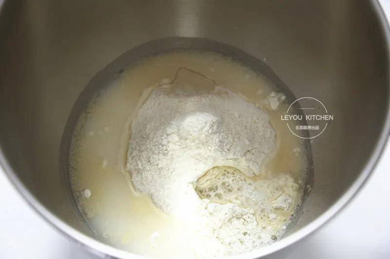 第一步:咱們先來和面。把面粉、鹽、糖、酵母粉、水放入廚師機桶中,開始揉面。沒有廚師機的話,就用手揉。