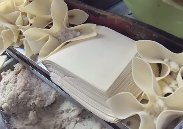 首先,大媽把包抄手剩下的抄手皮放在小攤上,然後再把準備瞭一些剁好的肉末,肉末一定要剁得非常的細,再放入胡椒粉、鹽等調料攪拌均勻,然後拿起一張抄手皮,把餡舀在裡面,包成一個像花一樣的抄手,看著非常的好看。