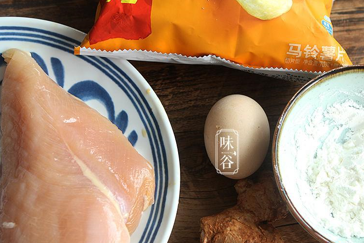 【材料】:雞胸肉1塊、薯片適量、、淀粉適量、雞蛋1個、薑適量、生抽2湯匙、蠔油1湯匙
