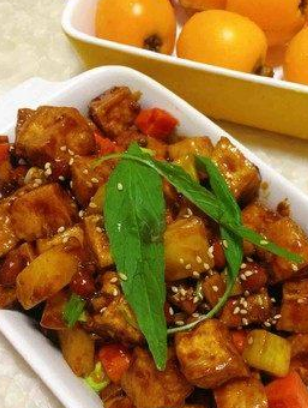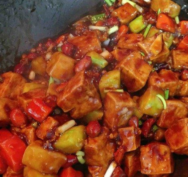 這道菜叫宮保豆腐,豆腐切塊焯水,以免豆腐味道過重,然後瀝掉水分,熱鍋加油燒熱炸豆腐,不要用鏟子翻動,會碎,可以輕輕晃動鍋豆腐就會滾動,也可以用木鏟翻豆腐,但是要等豆腐起皮翻,炸至金黃色豆幹撈出瀝油,花生炒熟,薑蒜切末,辣椒殼切段,蔥切段,黃瓜,土豆胡蘿卜切丁。醬料:淀粉,醋,醬油鹽,糖分別加碗裡,然後加水拌勻備用,熱油下花椒辣椒殼薑末蒜末爆香,倒入肉末翻炒,倒入土豆和胡蘿卜翻炒,再倒入豆腐花生炒,最後下黃瓜翻炒四五下,倒入醬料,手指即可。這道菜,成菜後