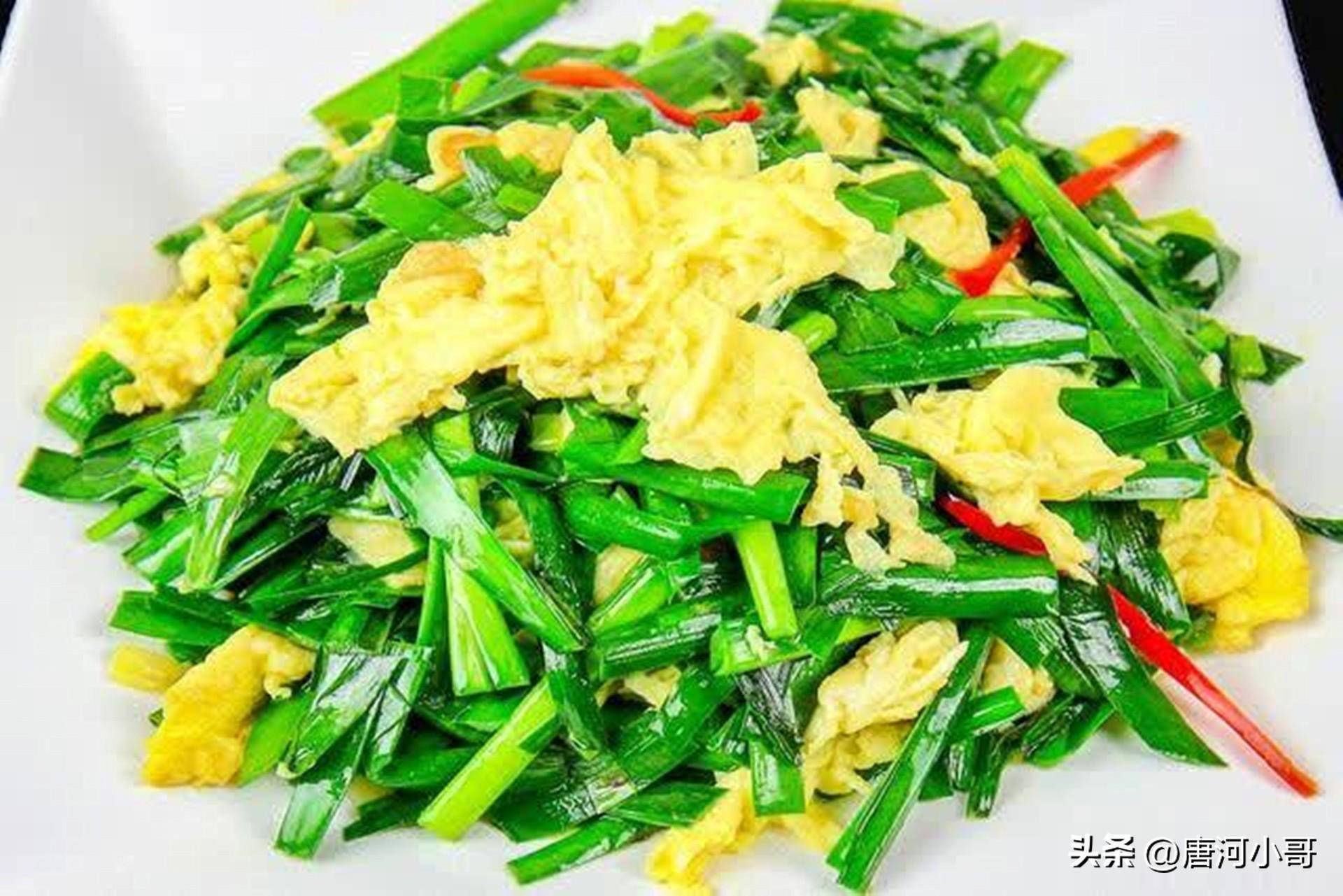 4、鍋裡留底油,倒入韭菜段,快速翻炒半分鐘,斷生即可,加入適量食鹽調味,倒入雞蛋塊,翻炒均勻後即可出鍋。