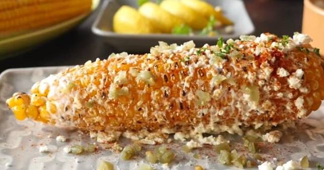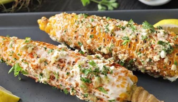烤好後把玉米撈出來放在盤子裡,然後往上面刷上一點用牛奶打成的泡,然後再撒上一些香菜末,玉米小吃就做好瞭,不但好吃,看上去還非常好看。