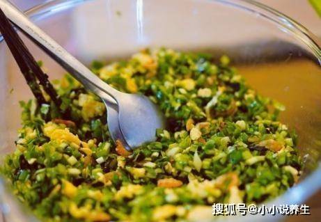 3、因為這些食材都比較新鮮香,不用加太多的香料調味也能入味。事先在韭菜裡加點油,讓韭菜表面形成一層薄膜,防止韭菜漏水。