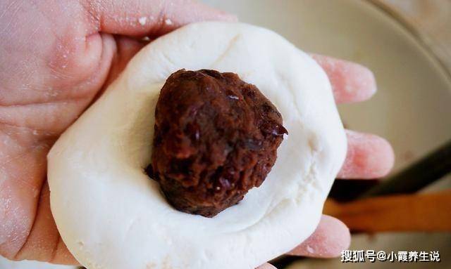 3、取適量豆餡,揉成球狀,放入餅底。我用的豆沙是自己做的,沒有的也可以用豆沙。