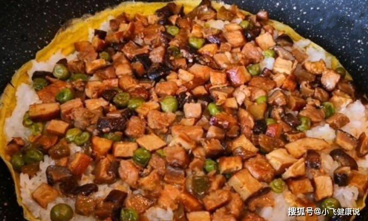 5、燒熱的平底鍋刷一層油,倒入面糊,搖動平底鍋使面糊鋪平,邊煎邊加入蛋液,將平底鍋搖一圈直到表面變硬,將蛋液鋪平,煎。蛋液變硬,用鍋鏟刮邊,翻面關火。把蒸好的糯米鋪在糯米上,再把炒好的小菜鋪在糯米上,用勺子壓實壓實,開中火,邊上淋少許油。起鍋,炒3分鐘左右,然後用一個起鍋,翻過來,倒回去,鍋邊倒少許食用油,把糯米炒3分鐘,然後把它放在盤子裡。我們把它切成小塊,方便食用。糯米真的很好吃。它有蛋殼的酥脆,糯米的粘稠,肉汁的濃香。我基本上每周做一次飯。朋友們,傢裡有糯米的話,可以試試這個方法哦!真的很好吃,很有營養。