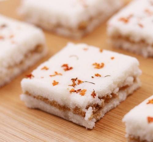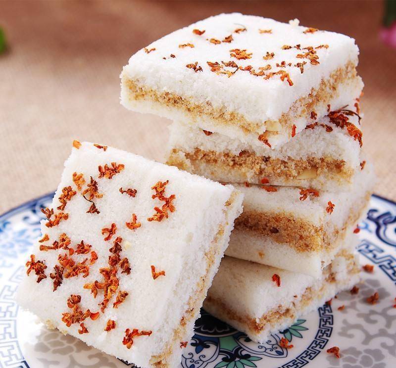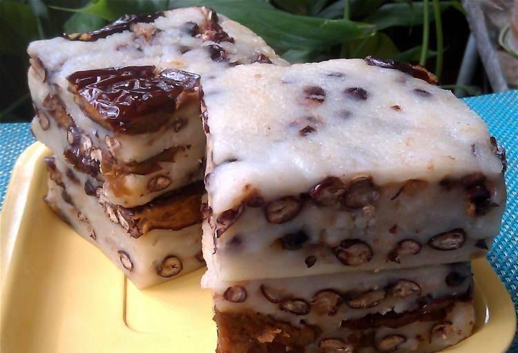 第五步:將燒熱的米飯倒入,切成小塊小心的擺在盤子裡,最後撒上椰蓉。小麥面筋很粘,切的時候最好用削皮刀或者牙簽。