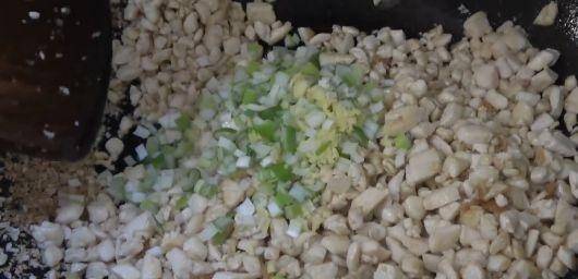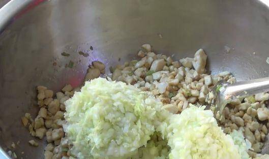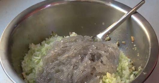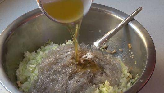 然後將卷心菜清洗幹凈,切碎,在卷心菜中撒一些鹽,以殺滅卷心菜的水分。幾分鐘後,將卷心菜中的水瀝幹,加入豆腐中。