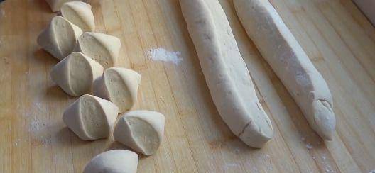 面團醒好後,取出再揉10分鐘,然後把面團分成3份,揉長,然後切成等份。