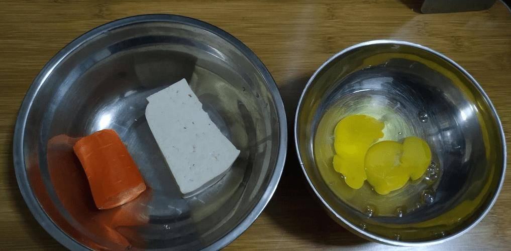 準備材料:面粉,胡蘿卜,雞蛋,豆腐,鹽,糖,生抽,香油,開水。