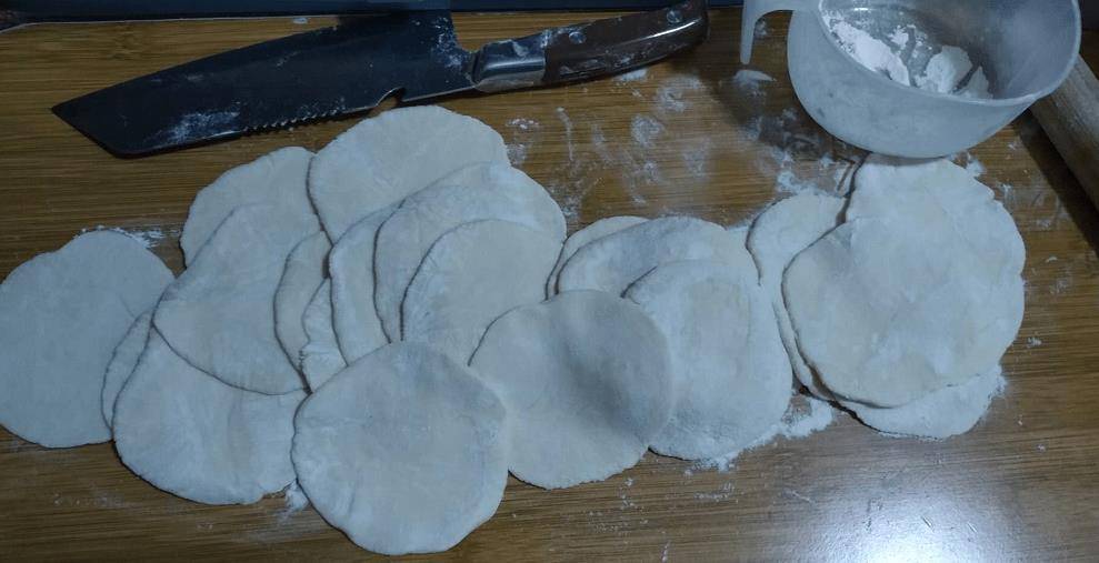 取出面團直接搟成條狀,切成小塊,用搟面杖搟開,別忘瞭撒幹面粉,以免粘連。