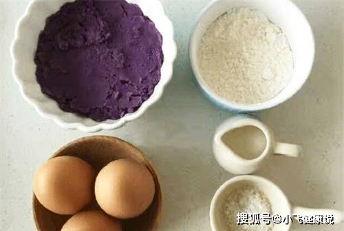 我們準備的材料是紫薯泥120克,雞蛋三個,純牛奶30毫升,面粉40克,鹽兩克。如果沒有現成的紫薯泥,可以買新鮮的紫薯,洗凈上鍋蒸熟,然後根據自己的口味加糖倒入泥裡。