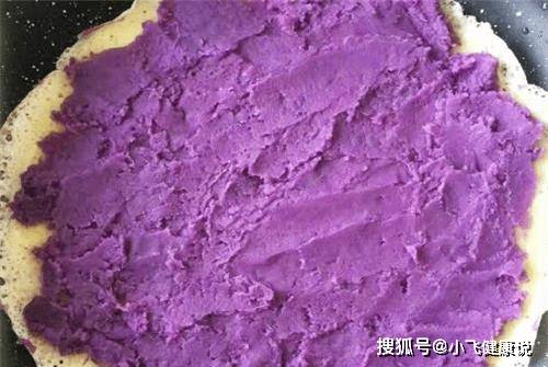 然後等到蛋液表面完全凝固,轉小火半夜把準備好的紫薯均勻鋪開。如果新手下廚房比較慢,這一步先關火。把紫薯泥抹在面團表面,要保持鎮定,不然容易糊。