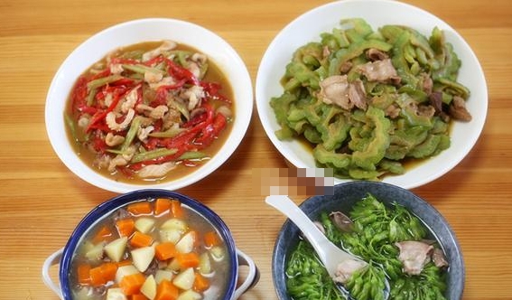 這個是豬雜湯,裡面的蔬菜我沒有吃過,也沒有在超市裡面見過這種蔬菜,但是吃起來還是很香的,我想應該是農村的特產吧,準婆婆說這燙她已經燉瞭一下午瞭,喝起來特別的鮮,一點腥味都沒有,我媽都做不出這麼好喝的湯來呢。還有一個苦瓜炒肉,苦瓜已經被處理的一點苦味都沒有瞭呢。