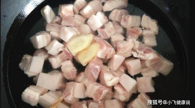 3、重新起鍋,倒入適量水,冷水下將切好的五花肉放入鍋中,加入適量料酒和薑片,大火煮熟,撇去浮沫起鍋,洗凈後煮2分鐘。2分鐘後取出,洗凈瀝幹備用。五花肉要過冷水下鍋,這樣可以讓五花肉中的血水充分煮熟,還能有效去除腥味;
