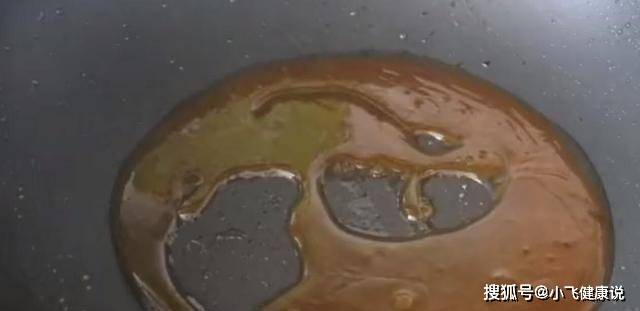 4.起鍋,鍋內倒入適量食用油,油熱下加入少許糖糖,轉小火繼續翻炒糖糖,待炒好的糖糖慢慢變成焦糖時顏色又小很多。如果有氣泡,說明糖色已經烤好瞭;