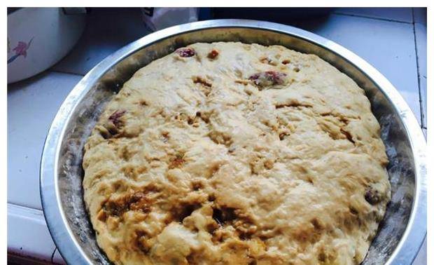 4、取出發酵好的面團(體積翻倍時發酵結束),將5克蘇打水溶解在少許熱水中,揉入面團中,然後取出面團,揉入紅棗。和面團一樣,一定要揉面團,這樣它就不會結塊。