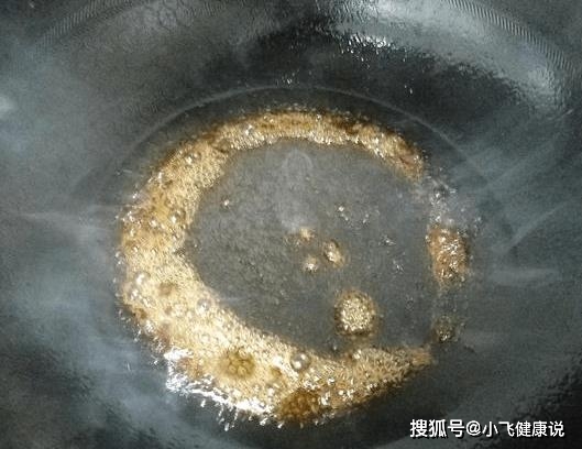 冰糖融化後,先是出現大泡泡,然後慢慢變成黃色的小泡泡。隨著溫度的繼續升高,黃色的小氣泡會變成黃色的泡沫。繼續加熱,顏色會變成紅棕色。此時你會聞到焦糖的香氣,糖色已炸。此時需要快速放入配料炒上色。