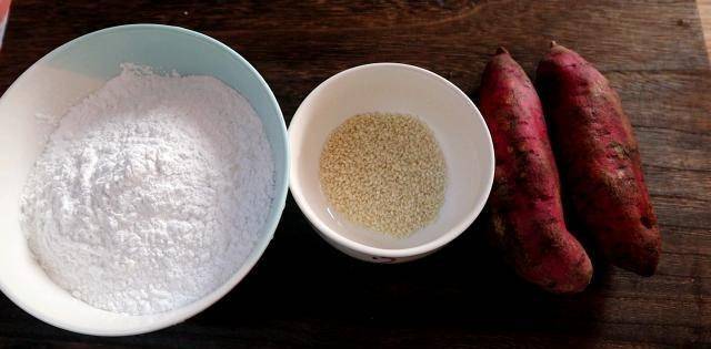 【原料】:紅薯兩個,糯米粉200克,芝麻30克,白糖40克。