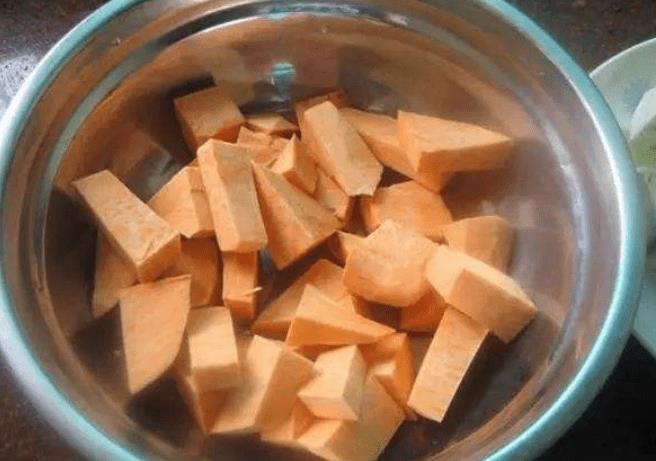 第一步:將買回來的紅薯去掉紅薯皮,將紅薯切成數塊待用,提前將小米浸泡20分鐘左右。