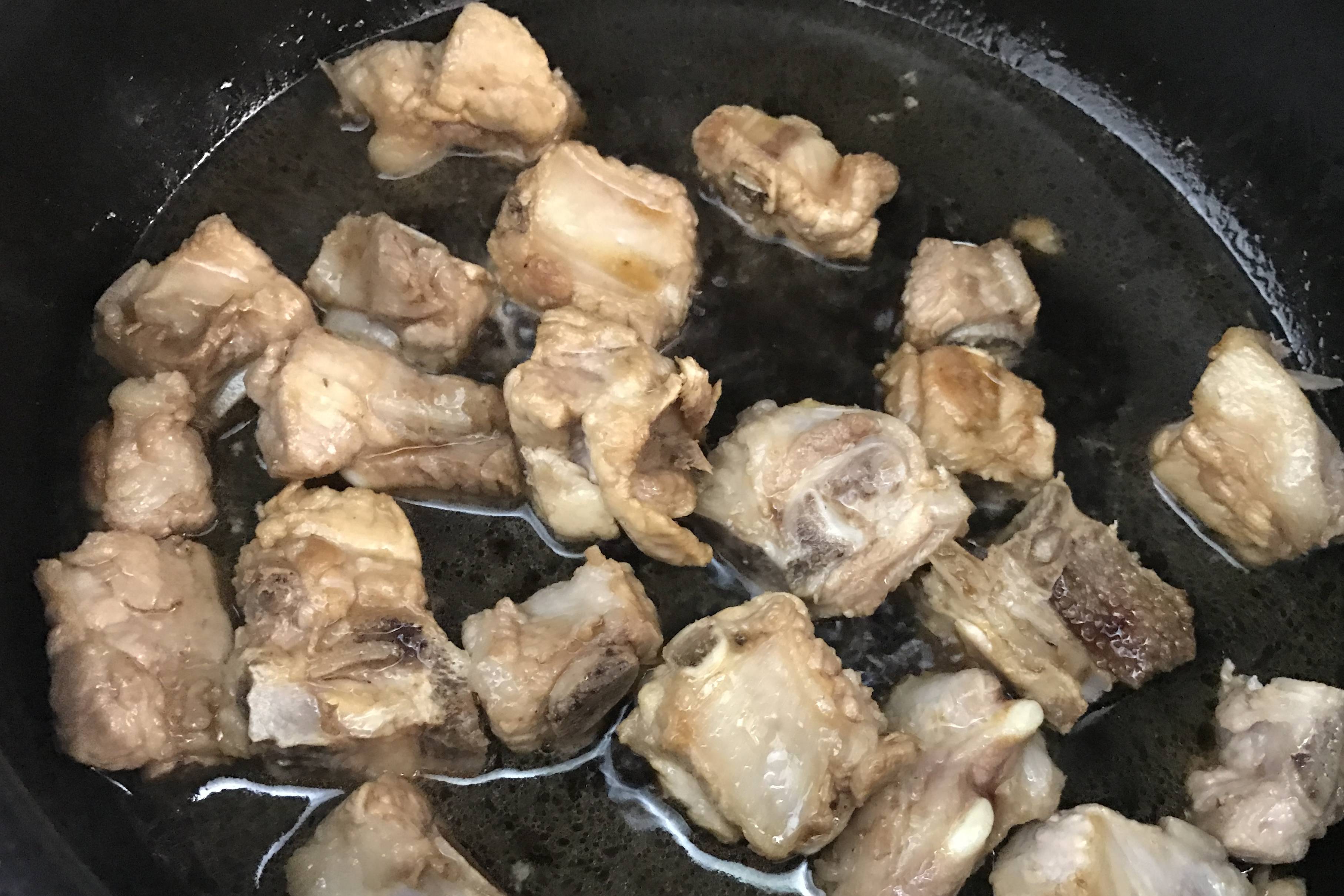 2、砂鍋中加入適量食用油,待油溫升高,將排骨放入,煎至排骨微黃。