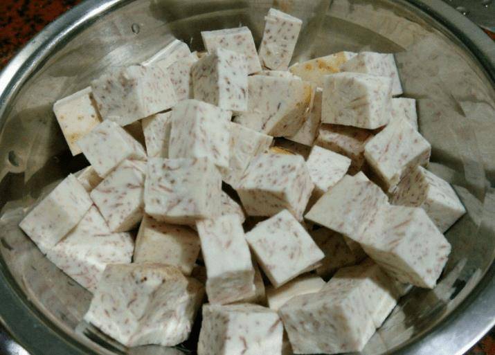 2.接下來我們需要處理芋頭,把它切成大小相等的塊,因為芋頭上的粘液一碰到我們的手就會癢。我們可以制作一副手套來防止這種情況發生。