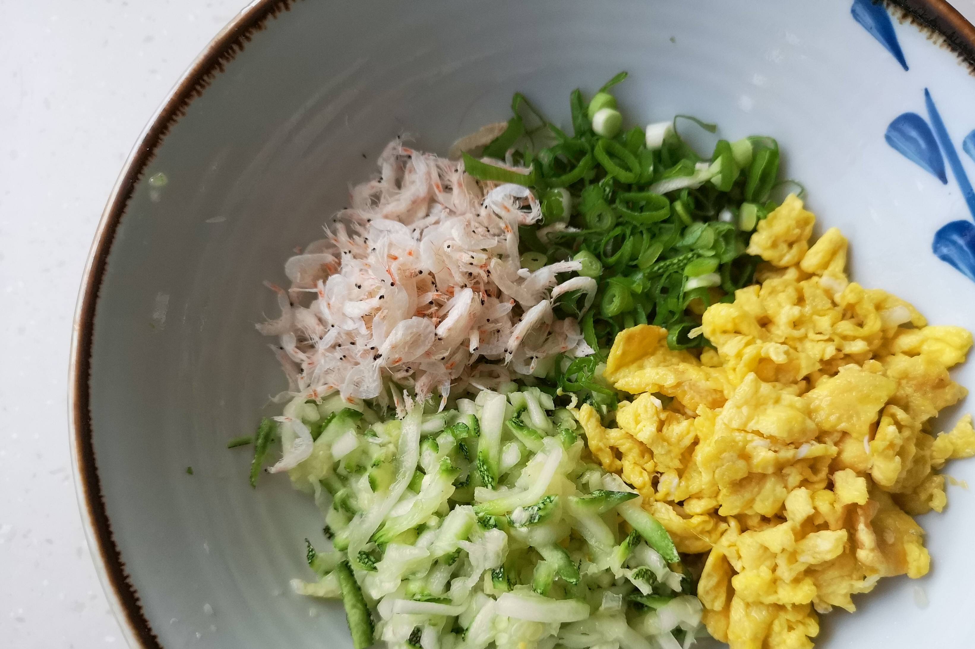 3、鍋中放入適量花生油,油熱後將兩個土雞蛋放入鍋中炒熟,用鍋鏟將雞蛋打散盛出來備用。西葫蘆絲擠幹水分,稍微剁碎一點,放入深碗中,加入蝦皮,蔥花,放涼後的雞蛋碎,加入適量鹽,一小勺蠔油,少許花生油攪拌均勻。